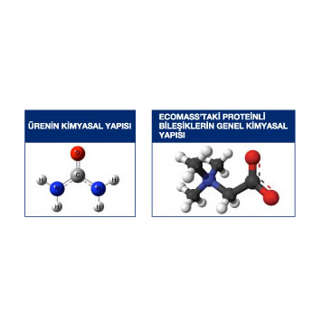 Kesinlikle içermez. Ecomass içeriğindeki proteinli bileşiklerin genel kimyasal yapısıyla, üre kimyasal yapısı aşağıda gösterilmiştir